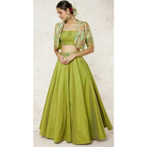 The Olive Green Lehenga Set features a contemporary design with a traditional touch. The outfit includes a solid olive green flared skirt paired with a matching cropped blouse that offers a clean and structured look. It is complemented by a short embroidered jacket adorned with intricate floral patterns in contrasting shades, adding texture and elegance. Made from smooth, lightweight fabric, this ensemble blends modern style with ethnic charm, making it perfect for festive occasions, weddings, or celebrations. Pair it with statement earrings and a clutch to complete the refined look.